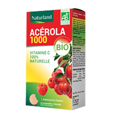 ACEROLA BIO 1000 NATURLAND apporte 173 mg de vitamine C 100 % naturelle par comprimé qui vous aide à maintenir tonus et vitalité.